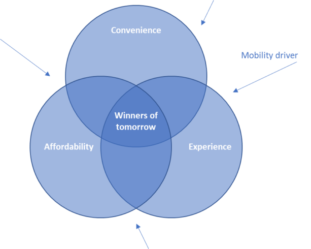 To conclude this article, what will the future of mobility be after this crisis. Personally, I have no idea. The only thing I am sure is the mobility behaviour of people is driven by 3 factors: convenience, experience and affordability (see the blue circles in the below picture). It seems that these factors are temporary put on hold on their side. This is why we see an increase in cycling or walking and fewer taxi rides, … But soon enough, they will govern back the end-user behaviours.